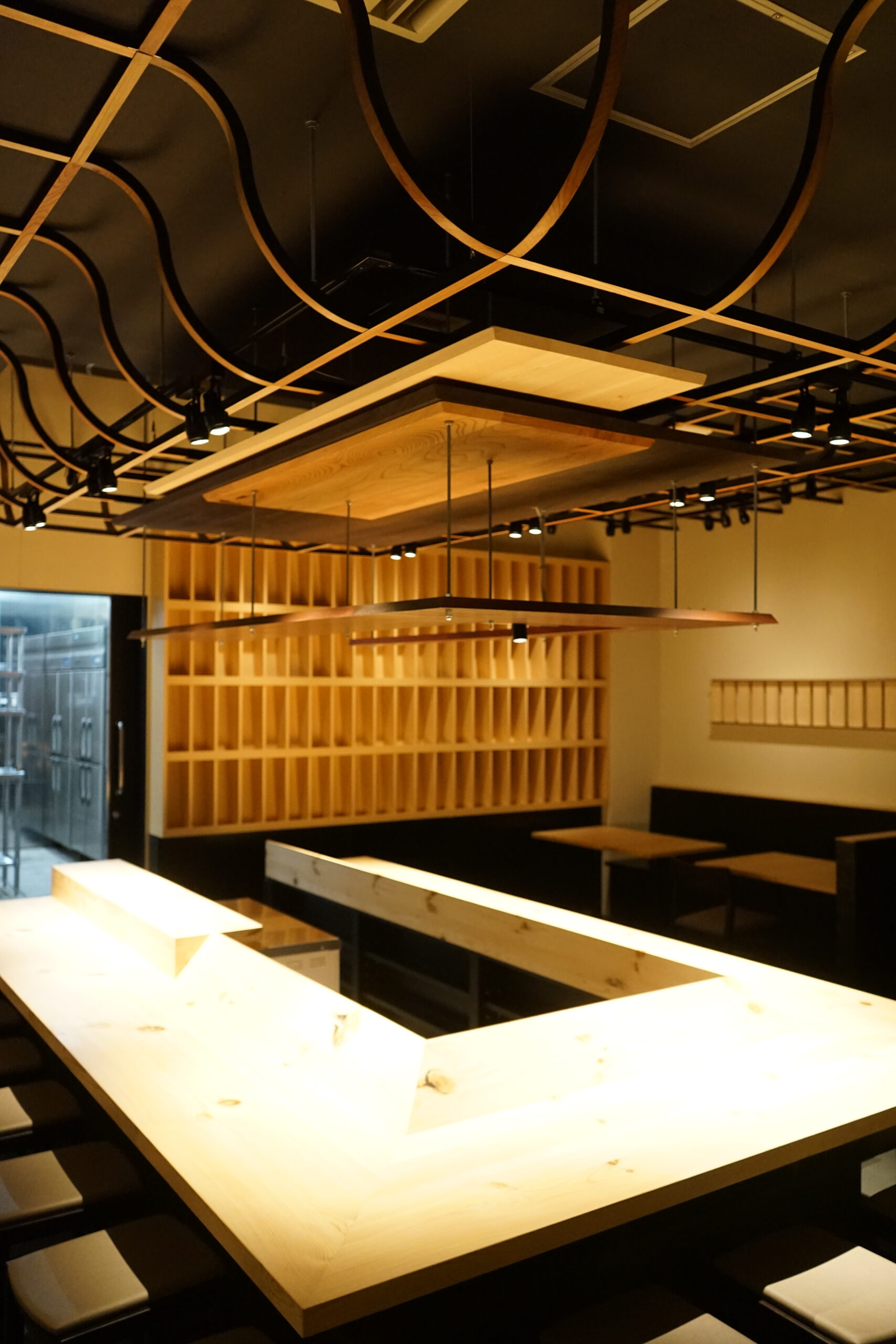 コの字型カウンターと天井の格子が美しい山翠舎店舗設計・施工・デザイン。