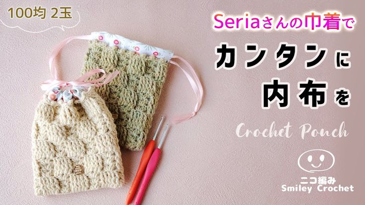 裏地付き巾着袋の作り方・編み方 内布を100均材料で簡単に♪ かぎ針編み DIY crochet pouch tutorial。