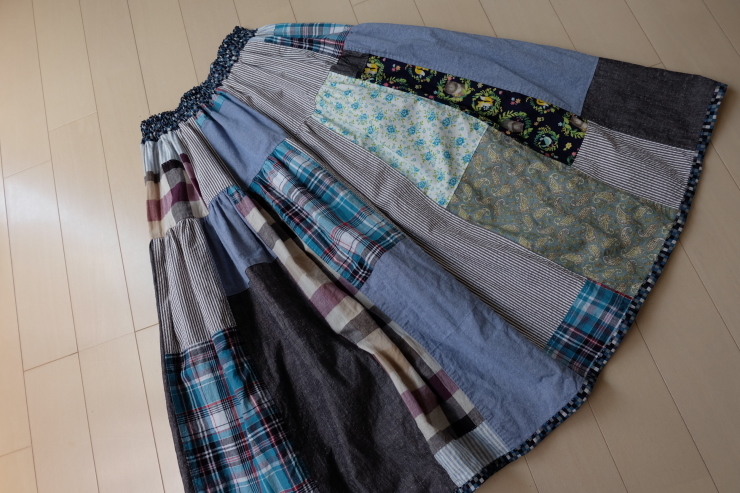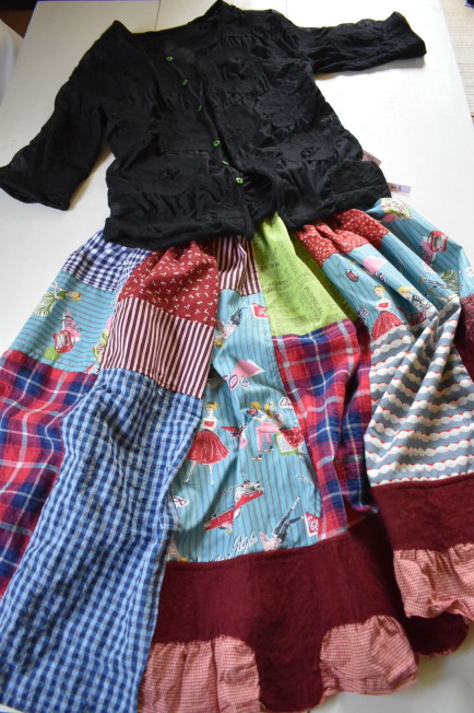 つぎはぎ布のギャザースカート&黒いカーディガン 櫻井はるみ服展あ・でゅまんblog。