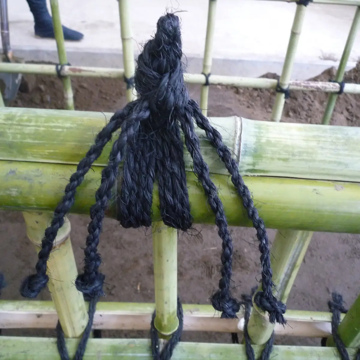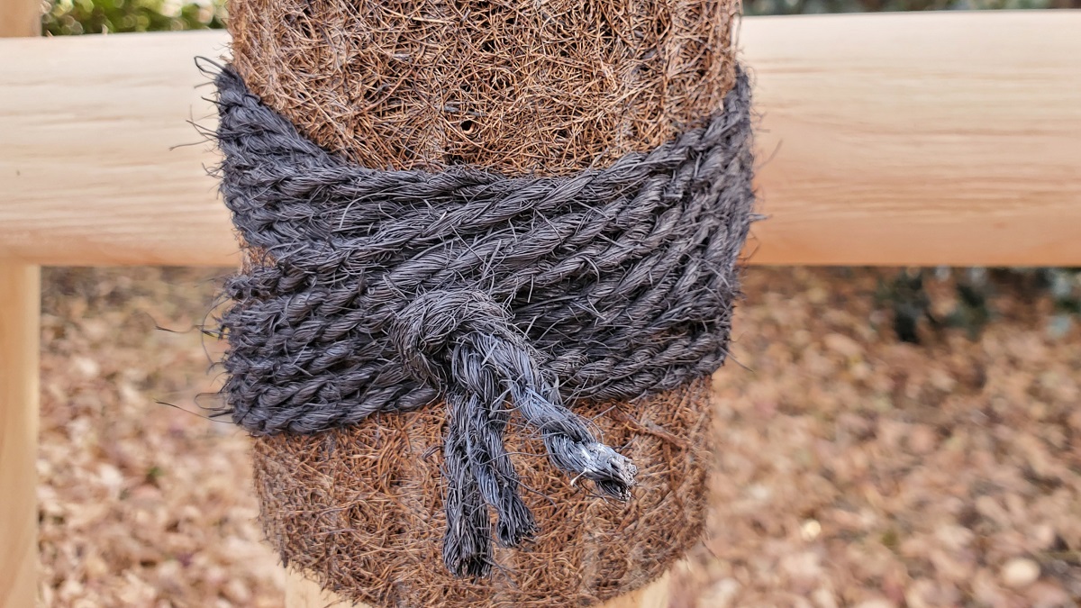 二脚鳥居支柱 シュロ縄の縛り方 真ん中で男結び・イボ結び楽手入れ。