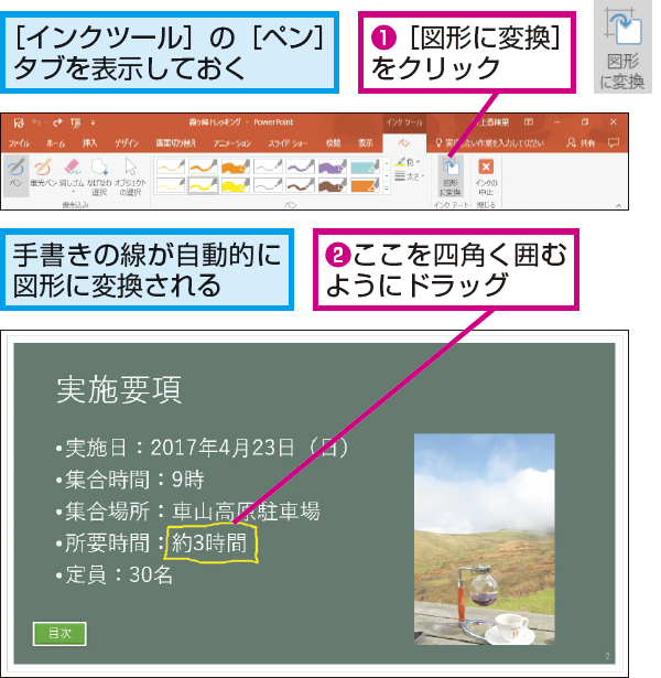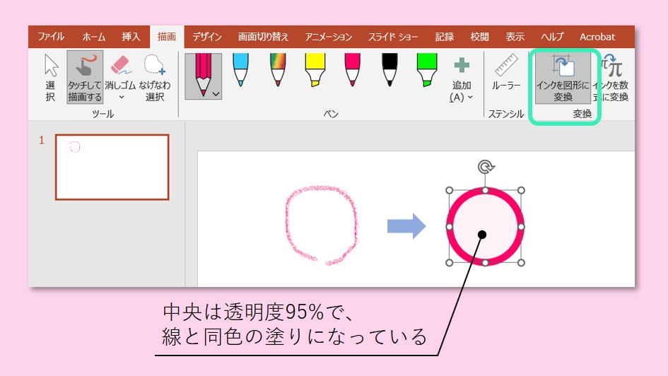 PowerPointの「ペン」で手描きの図を整った図形に変換できるできるネット。