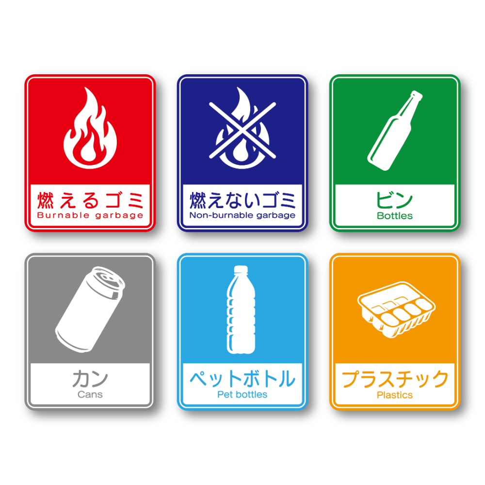 ゴミ分別ステッカーセット ゴミ箱用ラベル 燃えるゴミ・燃えないゴミ・ビン・カン・ペットボトル・プラスチック 6枚セット 50x60mm -RadiantSticker。
