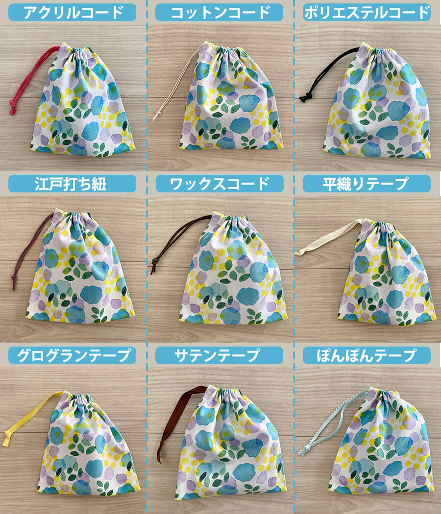 おしゃれな巾着袋のひも選び 実例集 ひもの通し方・長さ算出方法もnunocoto fabric。