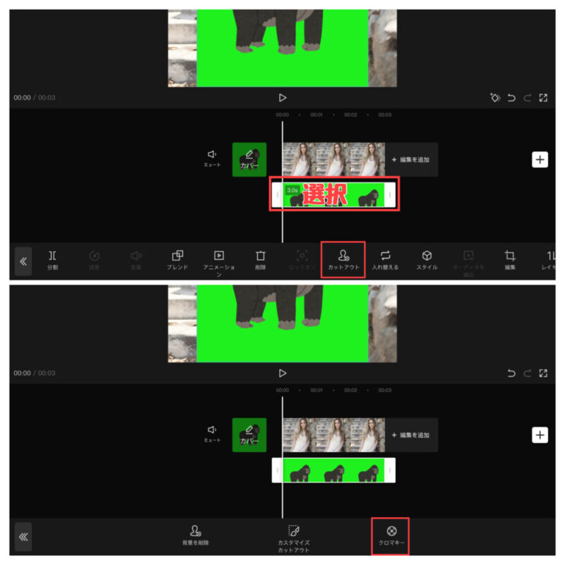 CapCutでグリーンスクリーン合成をする方法ご紹介。