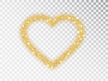 透明な背景にキラキラとゴールドのキラキラハートフレーム。カード、ポスター、招待状、チラシ、ギフト、カバーのバレンタインデーのデザインテンプレート。分離されたベクトルの黄金のほこり。無料ベクトル素材。