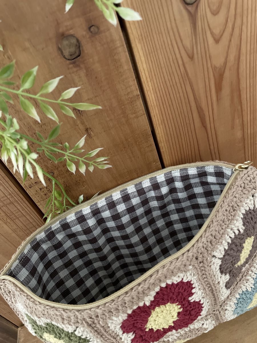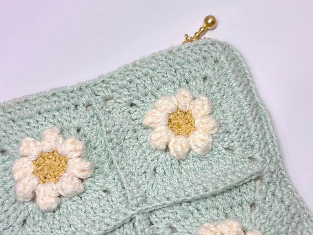 かぎ編みポーチ ファスナー内布付き デイジースクエア マルチポーチ ハンドメイド。
