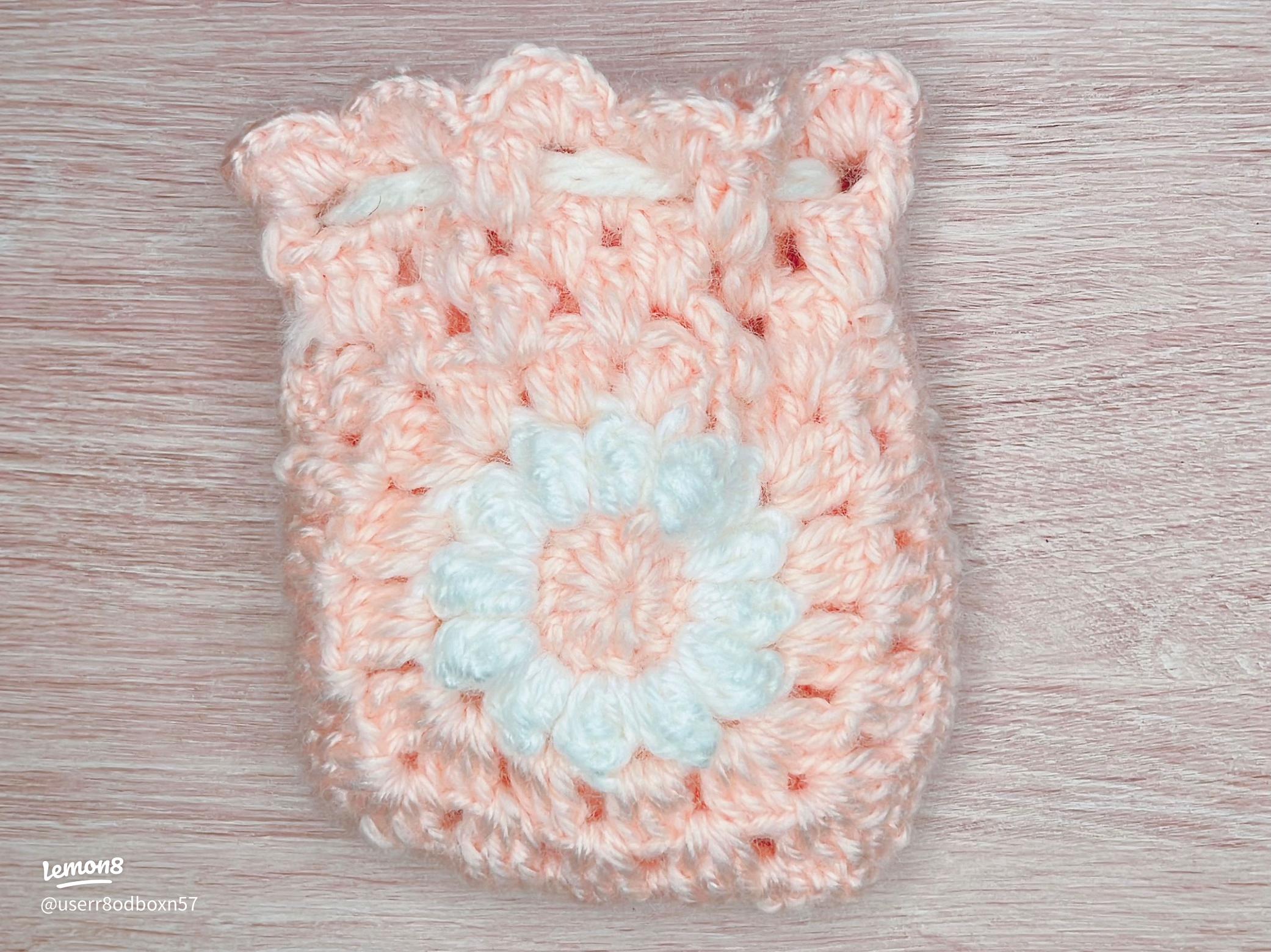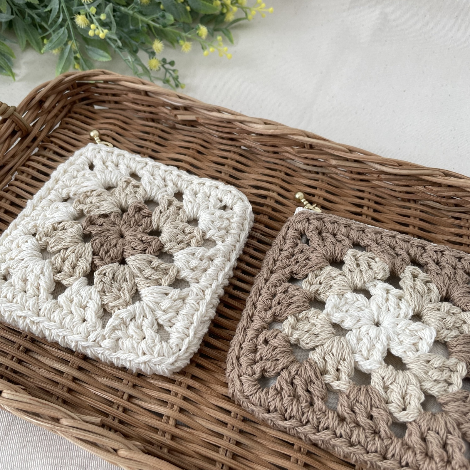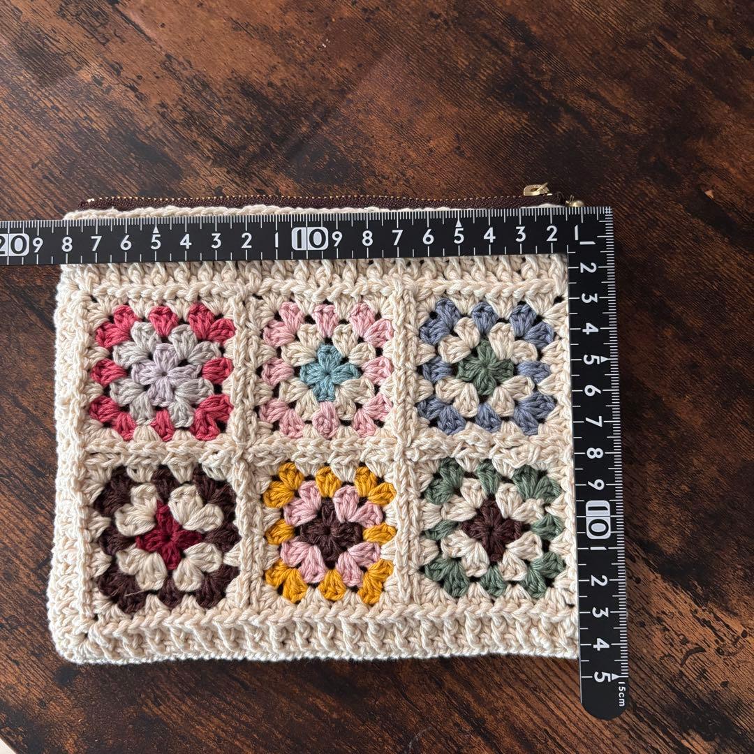 グラニースクエア ファスナー付きポーチ 手編み モチーフ編み 花柄 ハンドメイド。