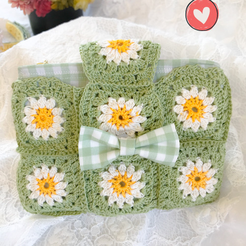 デイジーモチーフ グラニースクエア ポーチ かぎ針編み 小物入れ 2点。
