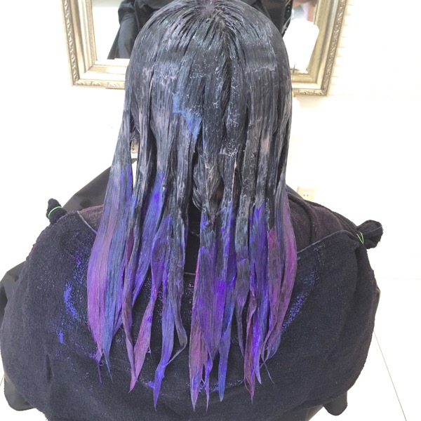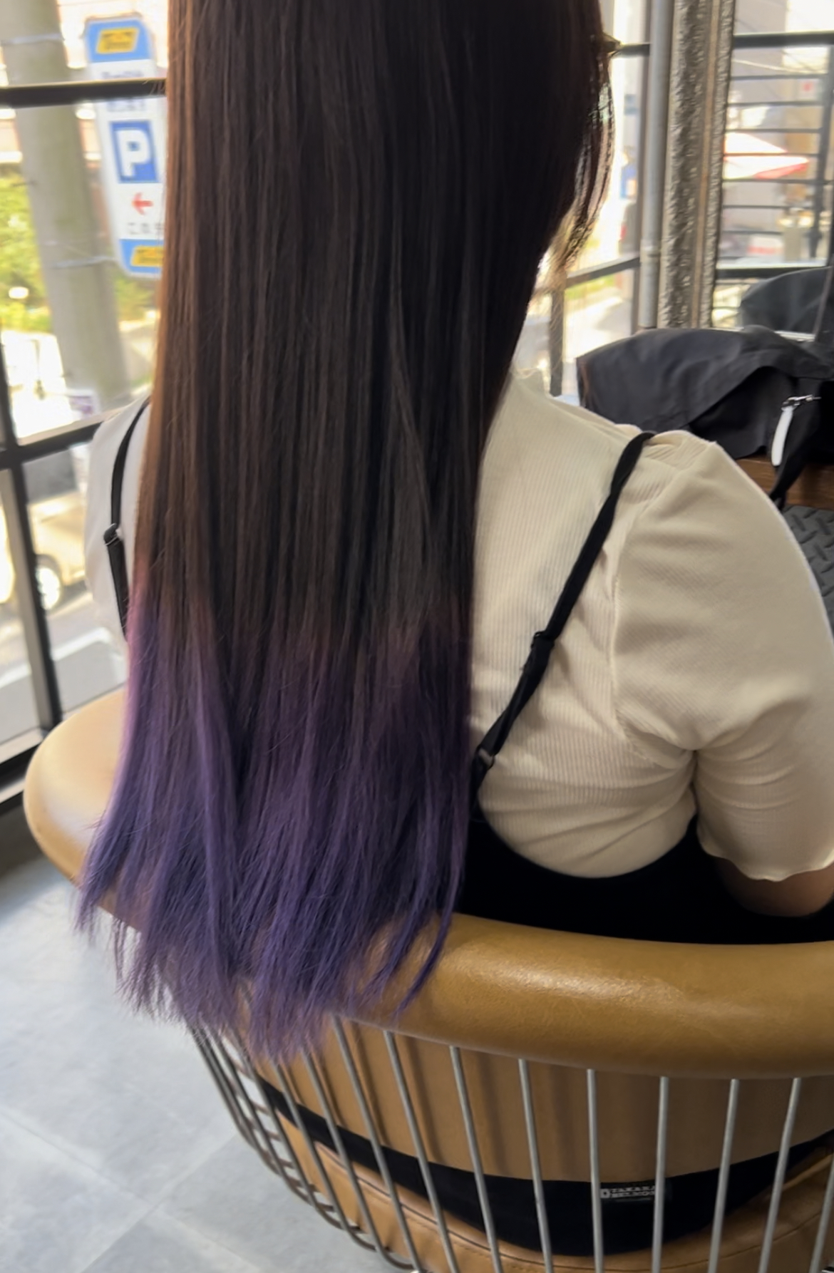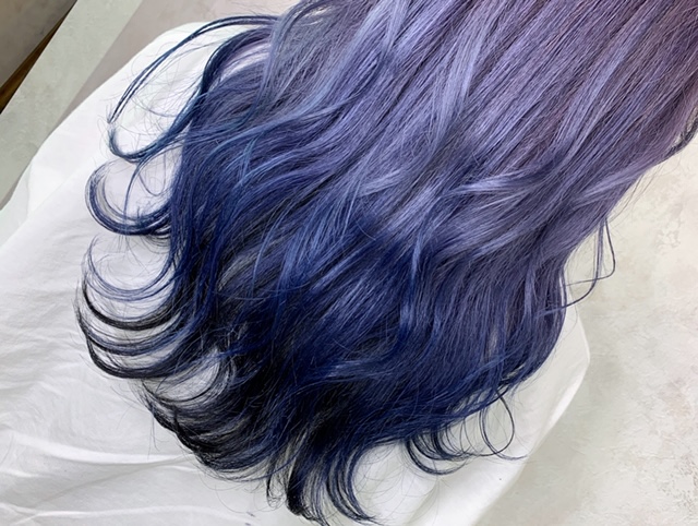 今回は色落ちが綺麗になるように18トーンくらいブリーチで抜いて青紫カラーでグラデーションカラーしました!上の髪は残留したくないので、染めてないです!ぼかしの境目は少し濃いめにカラーしました!グラデーションブルーラベンダー色落ち綺麗千葉美容室。