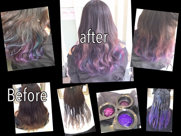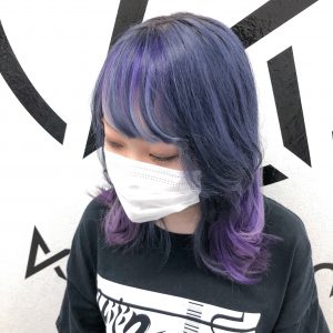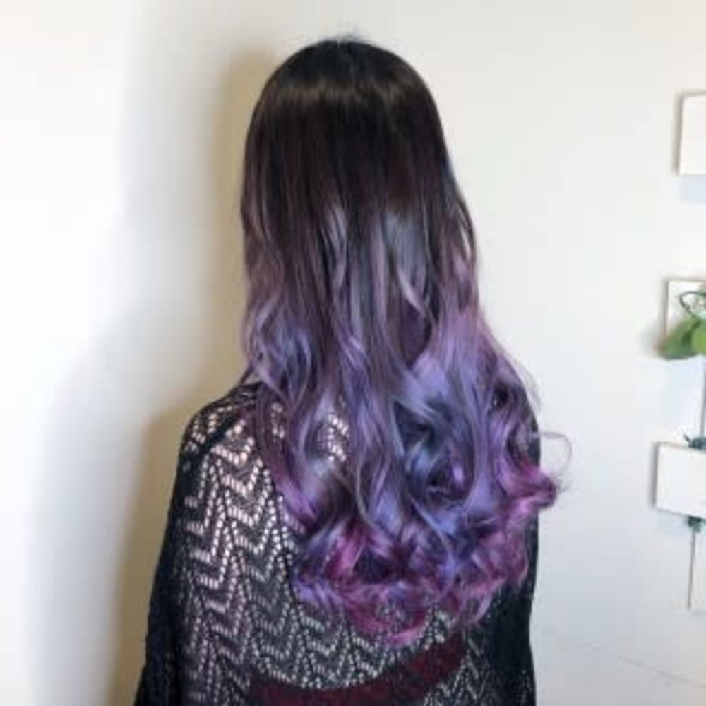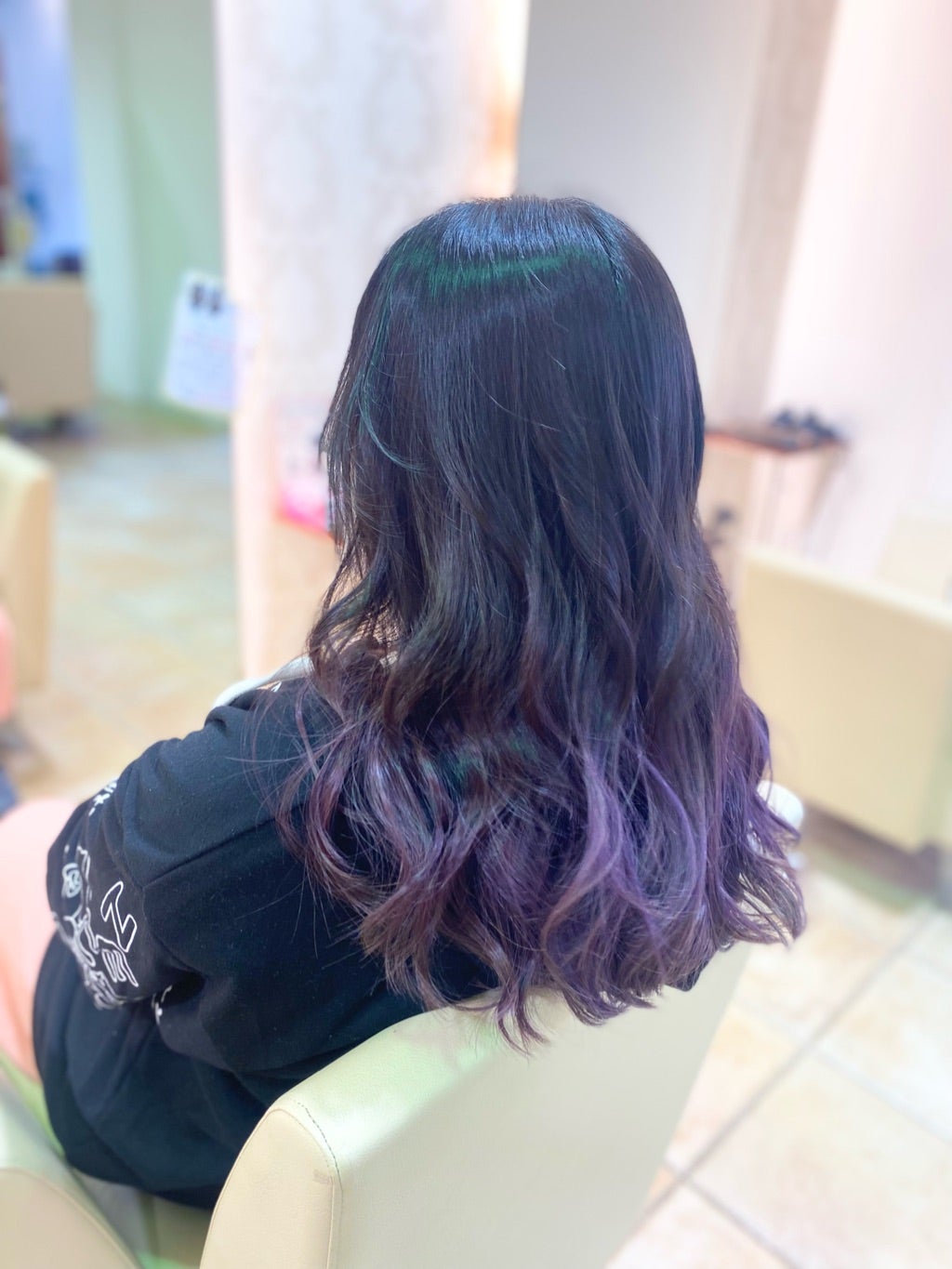 こちらは、青紫・紫・赤紫のカラーグラデーションです。 メルティングというテクニックで施術しました。 紫を主軸とした親和性のある配色なので比較的トライしやすいかと思います。カラーグラデーショングラデーションカラー紫パープルカラー埼玉美容室さいたま。