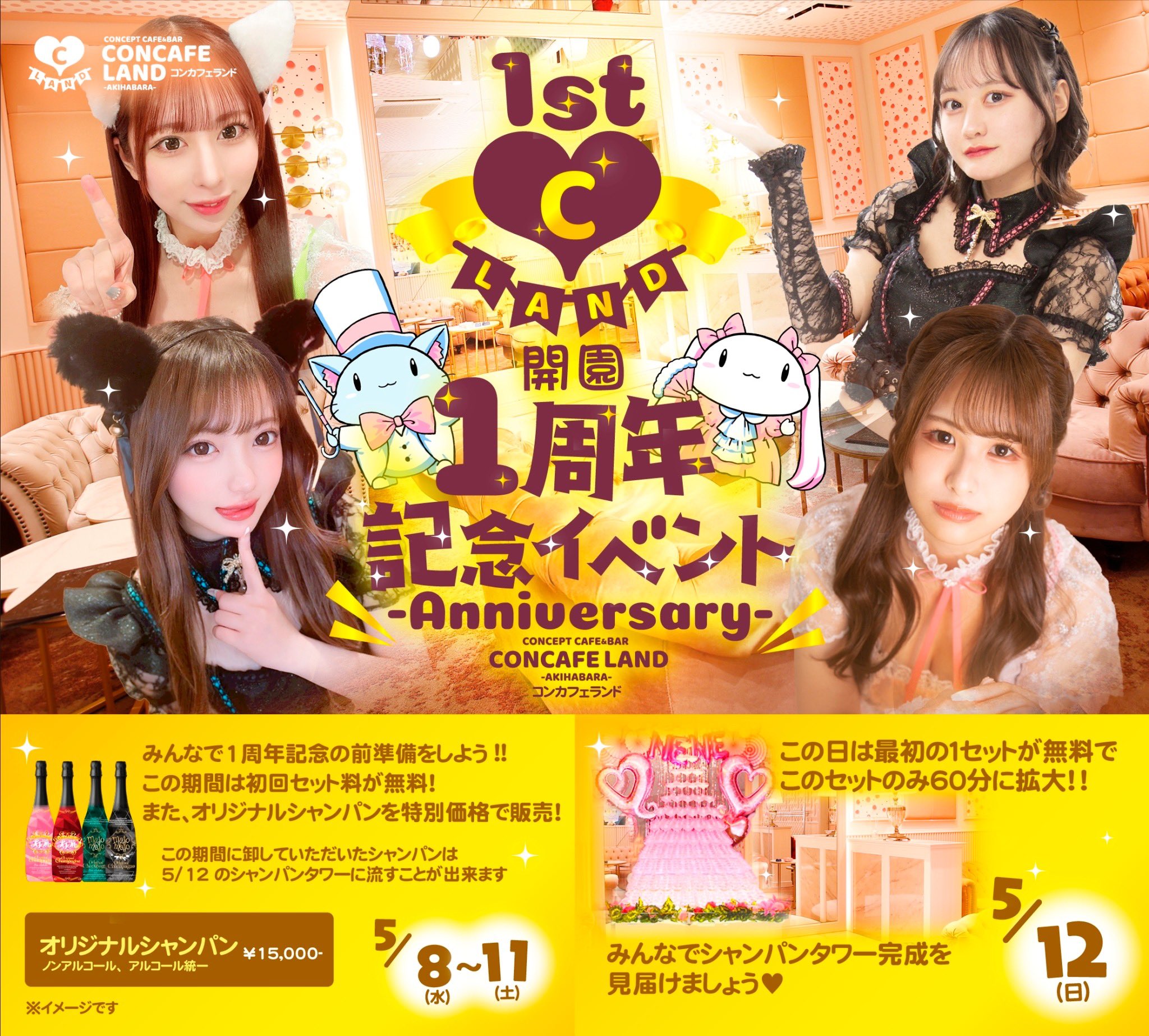 コンカフェランド@秋葉原最大級コンカフェ on X: "🎡コンカフェランド🎡 1周年記念イベント開催決定‼️5 12 日 でオープン1周年になります❣️ 当日みんなで オリジナルシャンパンタワー🥂🗼 完成させましょう💪✨ 詳細は画像をチェック✓〒101。