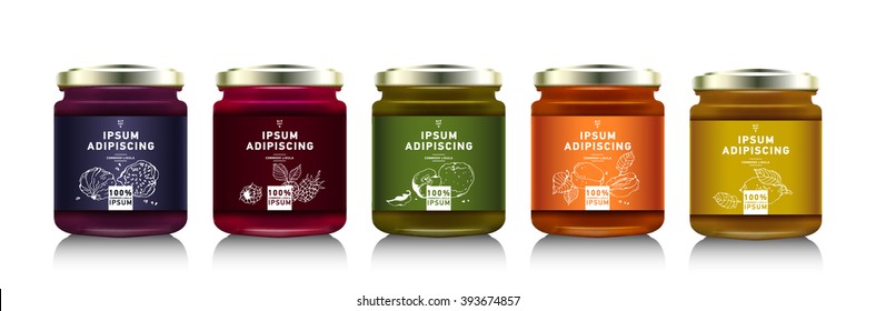 ジャム、設定または蜂蜜とガラス瓶。ベクトルイラストパッケージコレクション。ジャムのラベル。現実的な銀行だデザインラベルやバッジ付きのジャム瓶をモックする.ストックベクター ©oxygen_8 311429808。