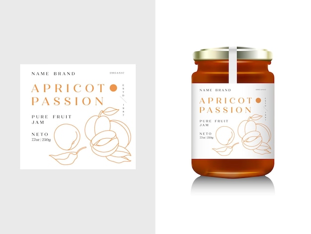 フルーツジャムデザインのためのリアルなガラス瓶のパッケージ。デザインラベル、タイポグラフィ、ラインアプリコットアイコンとアプリコットジャム。コンテナまたは瓶をモックアップしますPremiumベクトル素材。