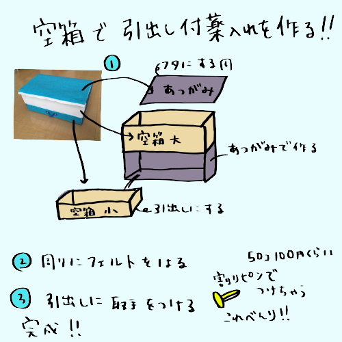 お菓子の空箱があったから、引き出し付き薬箱作った!カオブロ。