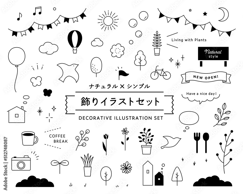 ナチュラル×シンプルな飾りイラストセット アイコン 装飾 あしらい フレーム イベント 植物 リボン Stock VectorAdobeStock。