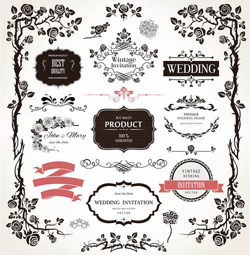 無料素材ガーリーなデザインがオシャレな飾り枠と看板風の文字のベクターセット。