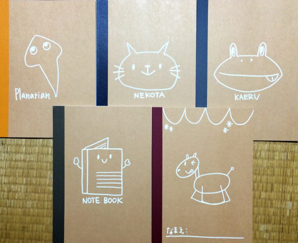 ゆりえるノート 左上からプラナリア、ネコ太、かえる、ノートくん、木馬2016年4月制作みやざきゆりえる。