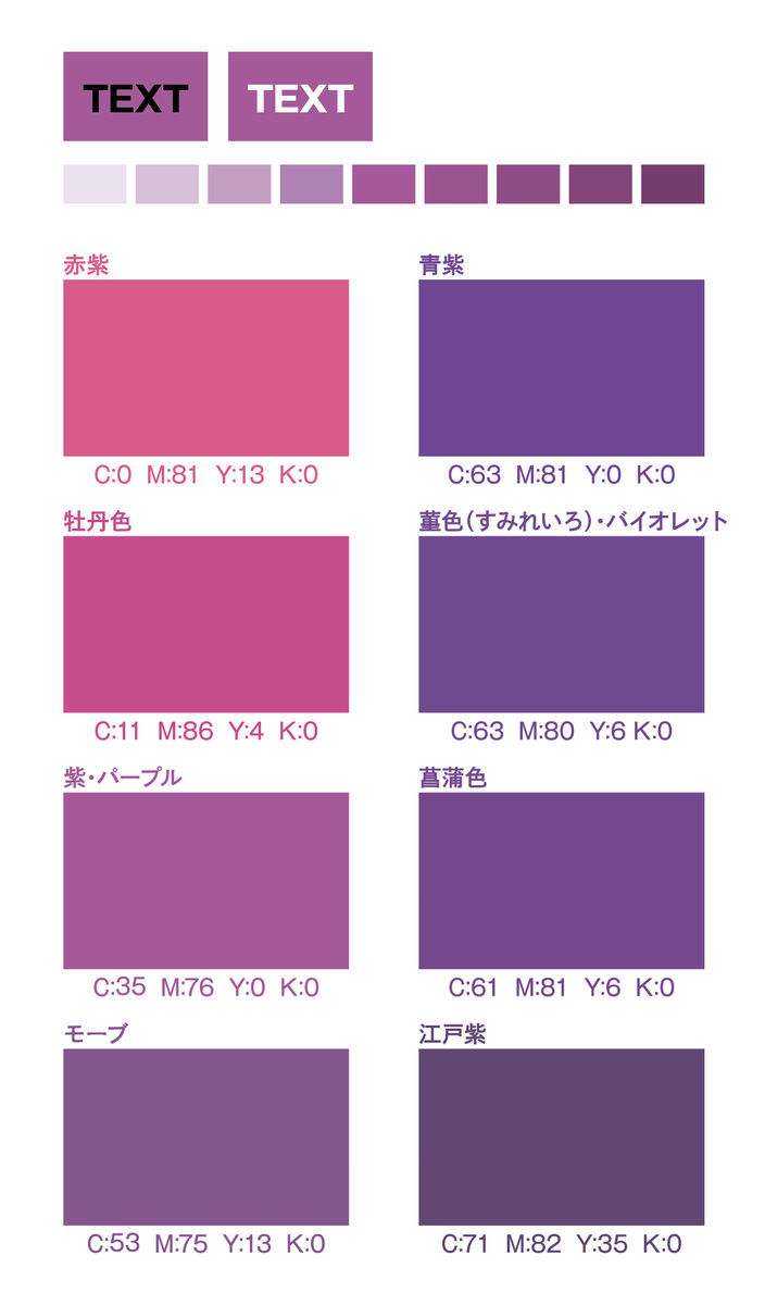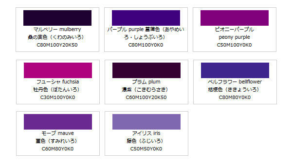 パープル Purple の色見本・カラーコード色彩図鑑 色の名前と色見本一覧。
