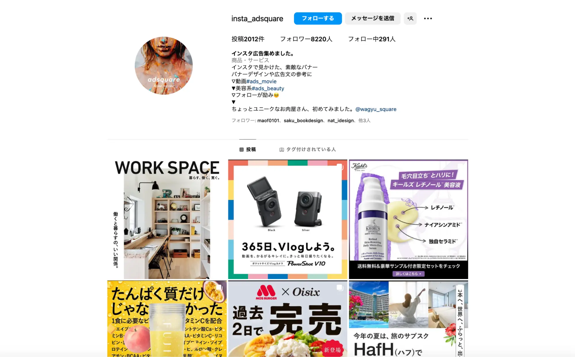 つづくデザイナー on X: "サイズが正方形の広告バナーを作る時、レイアウトの参考探すのが結構面倒だったんだけどこんなインスタアカウントを発見👀インスタ広告が集まってるから全部正方形!助かる〜☺️💫 https:t.co l9wniwdzaChttps:t.co UuDI7Pdy9B"X。