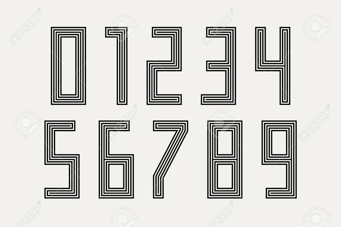 数字フォント 数字と数字を持つスポーツフォント 幾何学的な通常の太字のアウトライン番号 デザイン 創造的なタイポグラフィポスターのための強力な産業インラインスポーツフォント ベクトルイラストレーション ストックベクター ©FoxysGraphic 305353620。