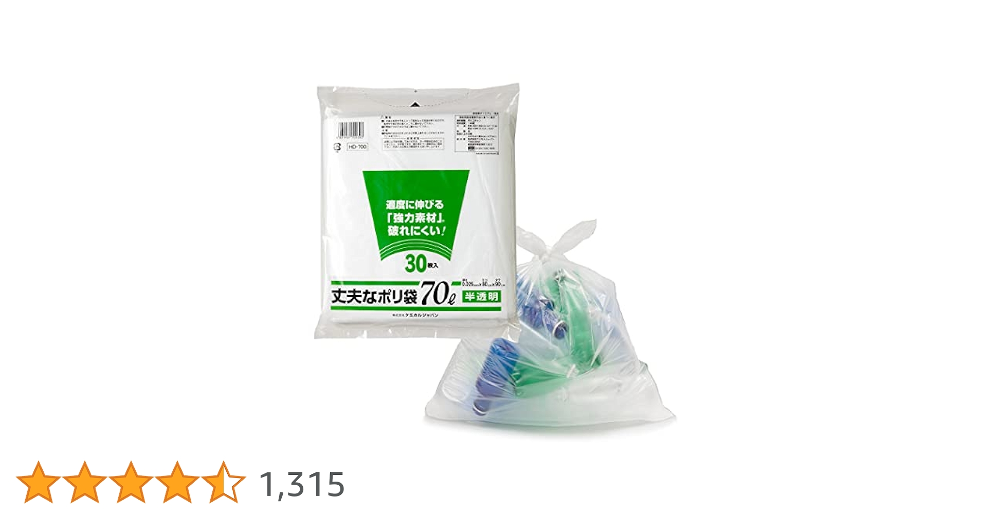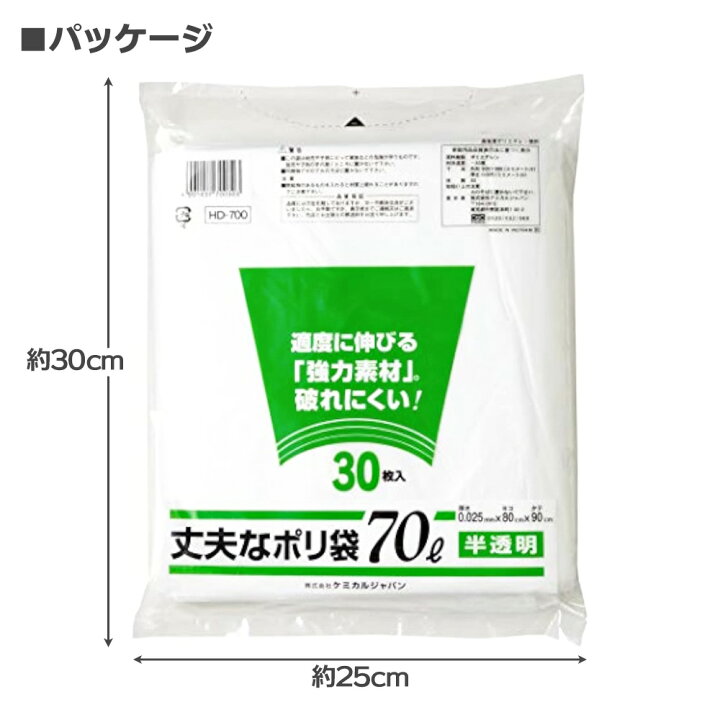 まとめ ケミカルジャパン 丈夫なポリ袋 厚口タイプ 半透明 70L HD-700 1パック 30枚×10セットAmazon.co.jp:ケミカルジャパン ゴミ袋 厚くて丈夫 70L 30枚 半透明 シャカシャカタイプ 横80㎝ 縦90cm 厚さ0.025mm 破れにくい ごみ袋 丈夫なポリ袋 HD-700。