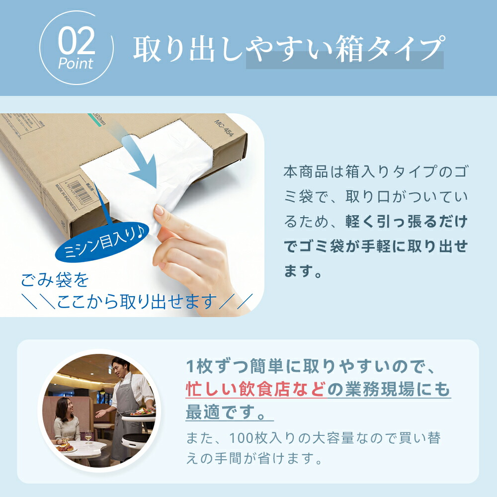 ゴミ袋 45リットル ゴミ袋 半透明 シャカシャカ。破れにくいメタロセンポリエチレン素材 を採用、環境に優しい!収納に便利な箱入りタイプで使いやすい。高密度ポリエチレン素材で丈夫かつ大容量!100枚入りで業務用にも家庭用にも対応。 MT4445L – 半透明 白 – 厚み0.022。