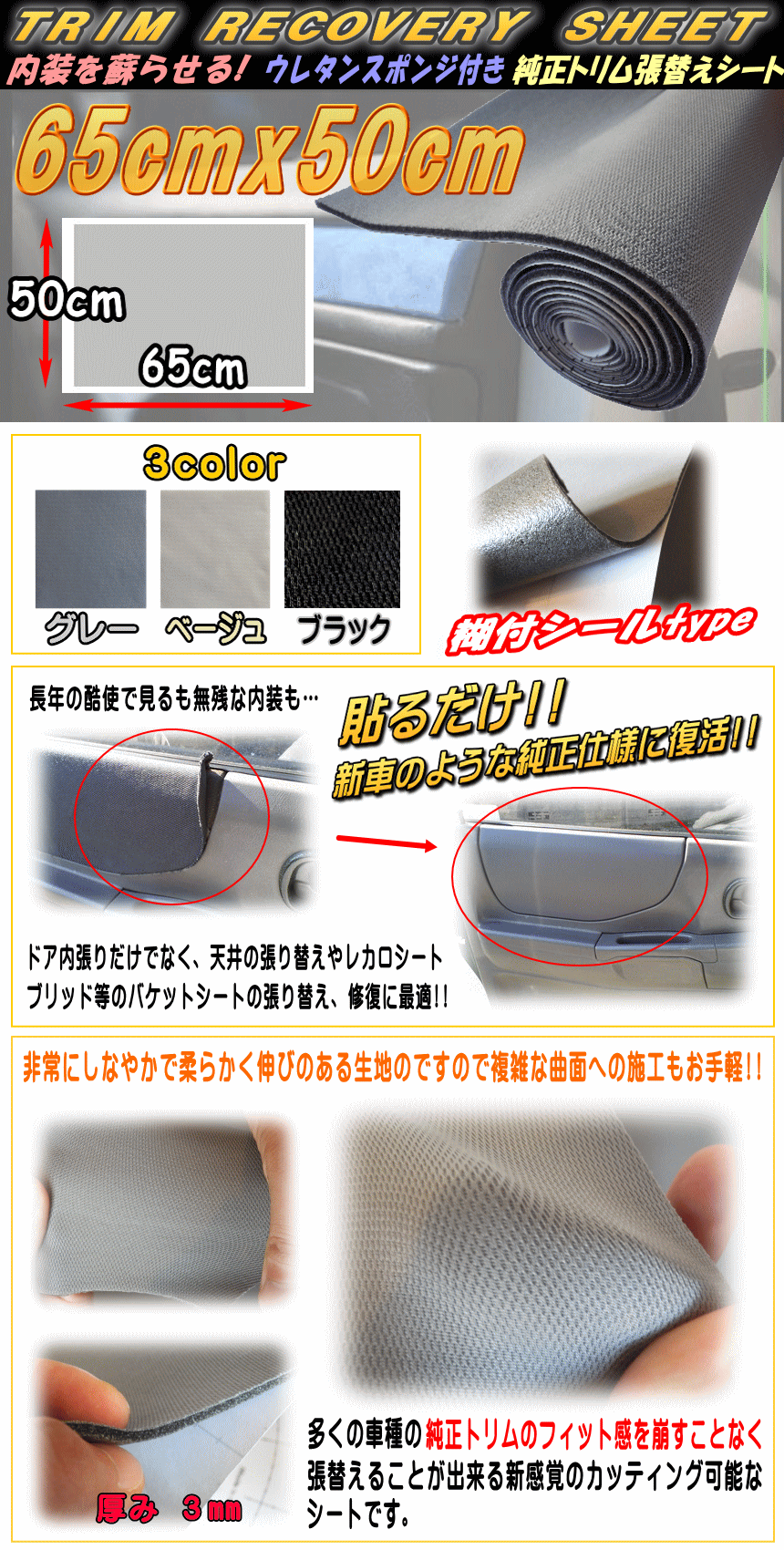 純正トリム張替えシート大幅135cm×1m〜 内装 天井 張り替え用メッシュ生地 糊付き ウレタン スポンジ付き 3D曲面対応 ステッカー延長可能。