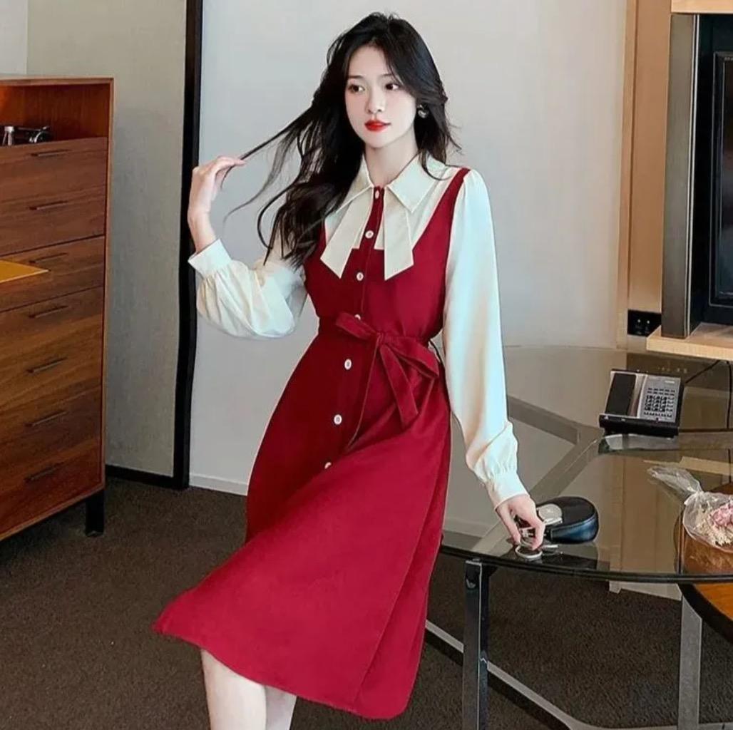 可愛いリボンボウタイ 釦付き 配色切替赤Aラインワンピース - メルカリ。