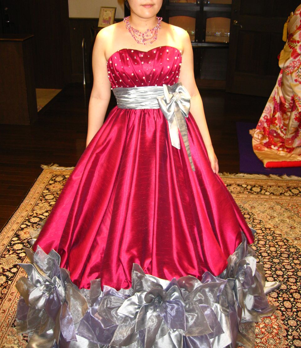 大人かわいいカラードレス。ワインレッドとグレーの配色が大人びていて、クール&キュートな雰囲 衣装口コミ・評判ノートルダム周南併設ドレスサロン ウエディングパーク。