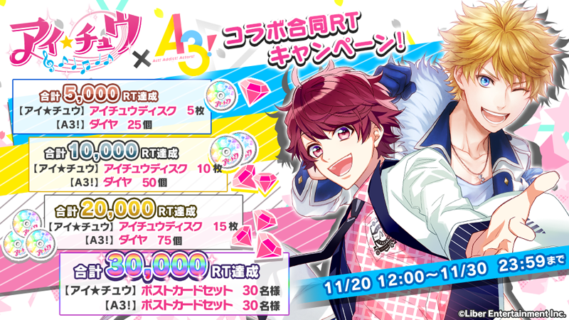 恋愛リズムアドベンチャーゲーム『アイ☆チュウ』と イケメン役者育成ゲーム『A3! エースリー』のコラボキャンペーン開催のお知らせ新着情報株式会社リベル・エンタテインメント。