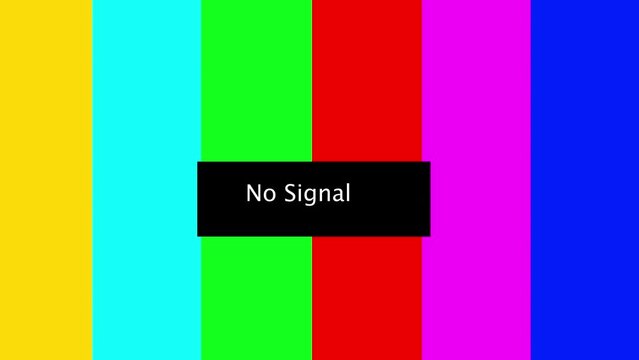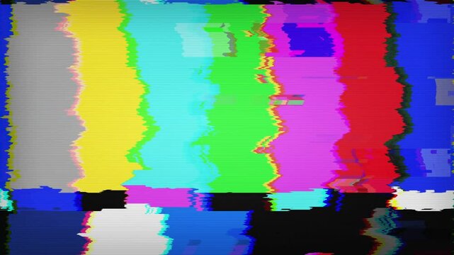 Television screen error Color Bars data glitches. Intentional glitchdistortion. Test pattern from a tv transmission, with colorful bars, ablack box and the warning text No signal。