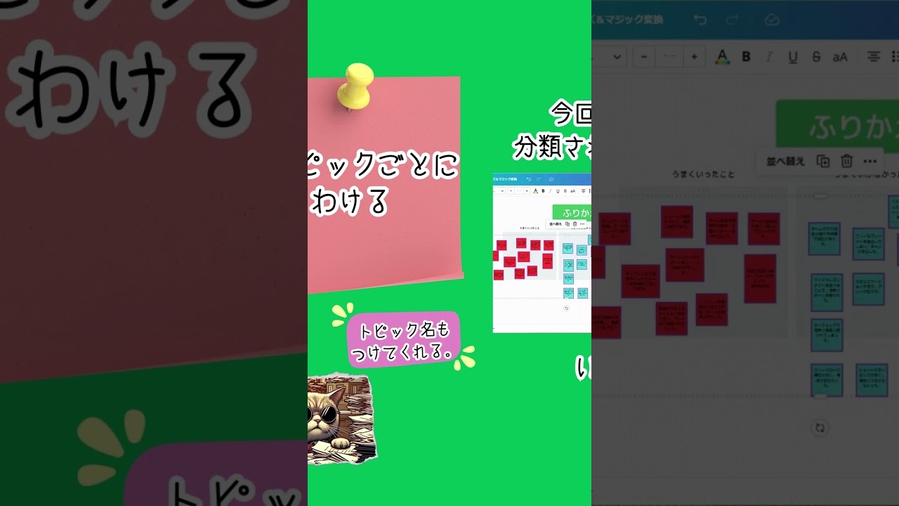4つの付箋の整理のしかた。 均等、色・名前、トピックでわける。 canvaict活用働き方改革ictホワイトボード付箋学校。