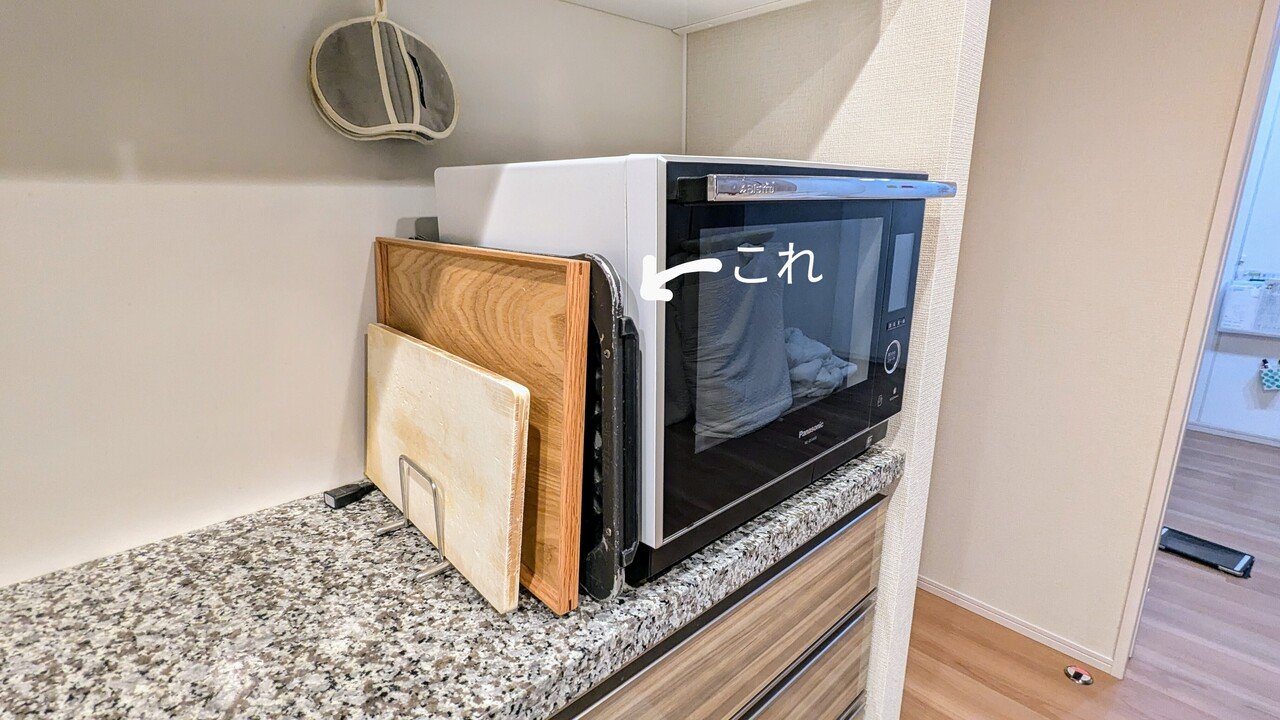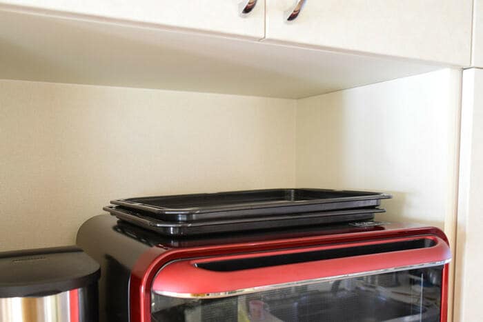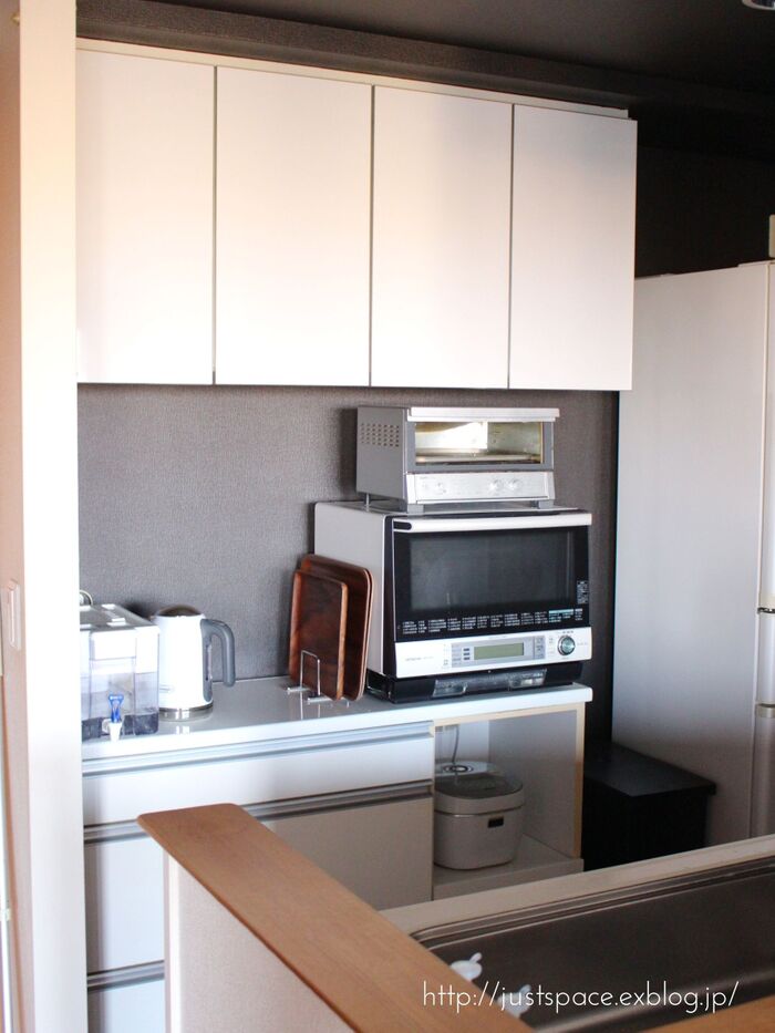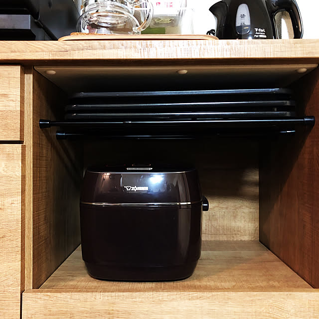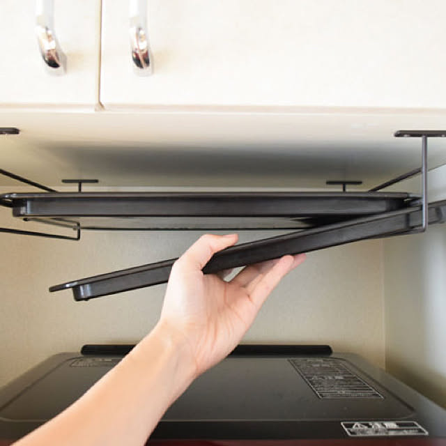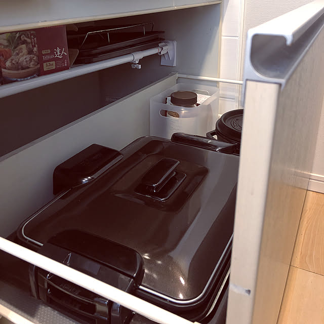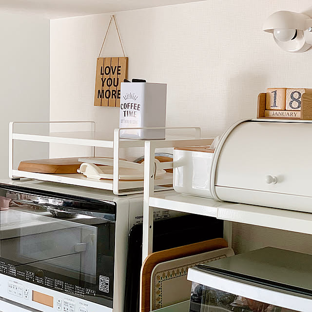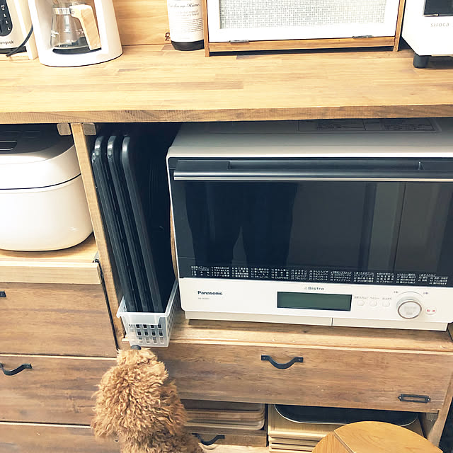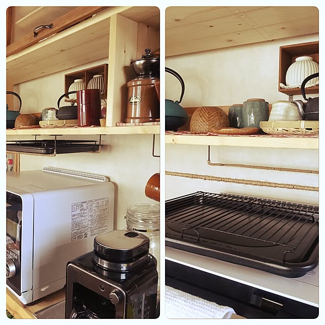 TNK. 長い間、定位置迷子だったオーブンレンジの天板。 セリアのアイアンウォールバーを棚の下に取り付けて 引き出し式の収納にしました。全く無駄の無い動線、めちゃ楽〜!笑 嬉しくてつい、 用もないのに出し入れしてしまいます🤭 トースターの天板収納にも追加購入。