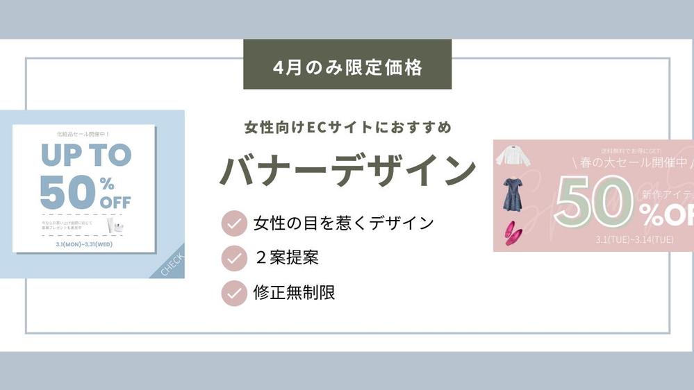 ECサイトなどに!女性向けデザインバナー制作します 有名ブランドECサイトでバナーやLPをデザインしてるプロですココナラ。