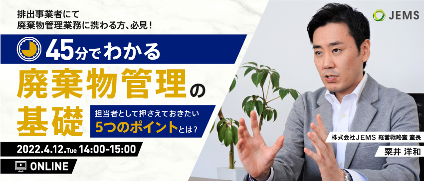4 17 水 開催 これだけは押さえておきたい!実務に求められる廃棄物処理法の基礎 無料オンラインセミナー株式会社JEMSのプレスリリース。