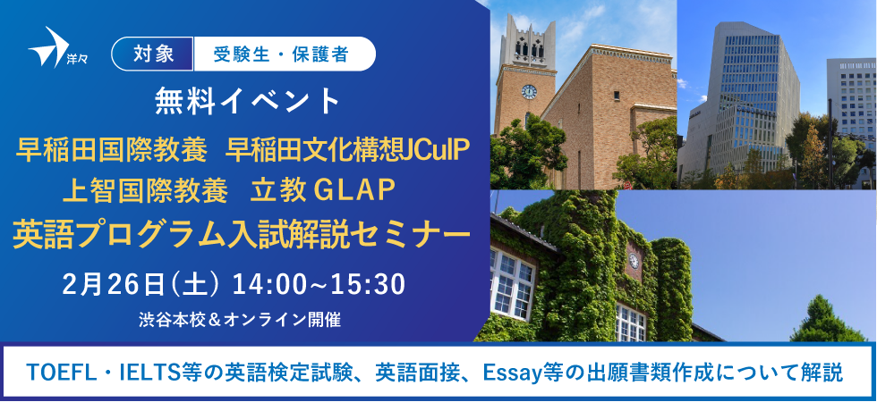 2.26 土無料イベント 英語・通訳なし早稲田国際教養・早稲田文化構想JCulP・上智国際教養・立教GLAP 英語プログラム入試解説セミナーセミナー・イベント。