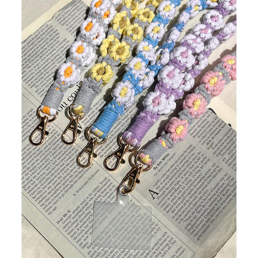 マクラメ編み: ふんわりフラワーのスマホショルダー作り方とアイデア。