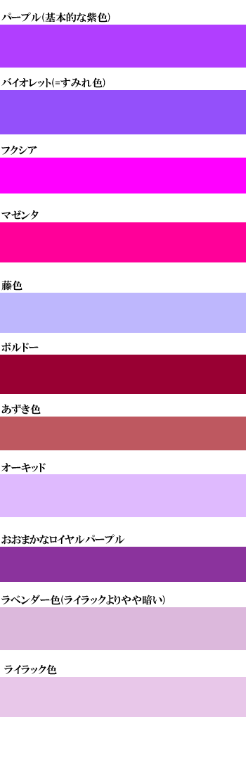 パープル Purple の色見本・カラーコード色彩図鑑 色の名前と色見本一覧。