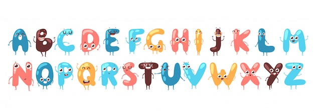 面白いフォント。笑顔、英語のアルファベットの文字漫画のキャラクター。子供のための活版印刷フォント、面白いカラフルな活字、かわいい文字Premiumベクトル素材。