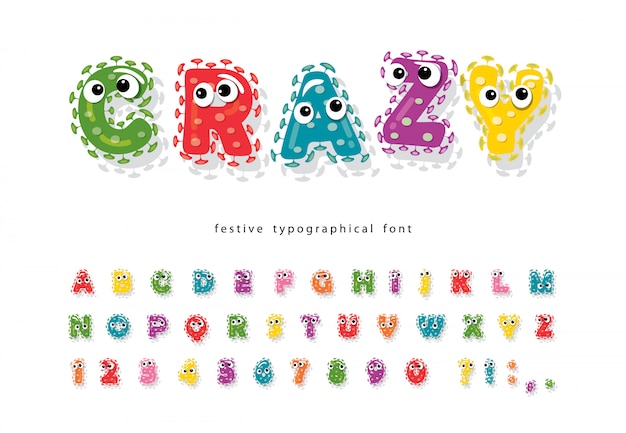目で面白い子供のフォントです。漫画のふわふわのカラフルなアルファベット。Premiumベクトル素材。