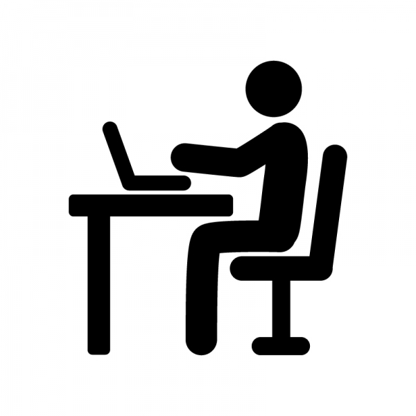 机でノートパソコンする人の白黒シルエット無料のAi・PNG白黒シルエットイラスト。