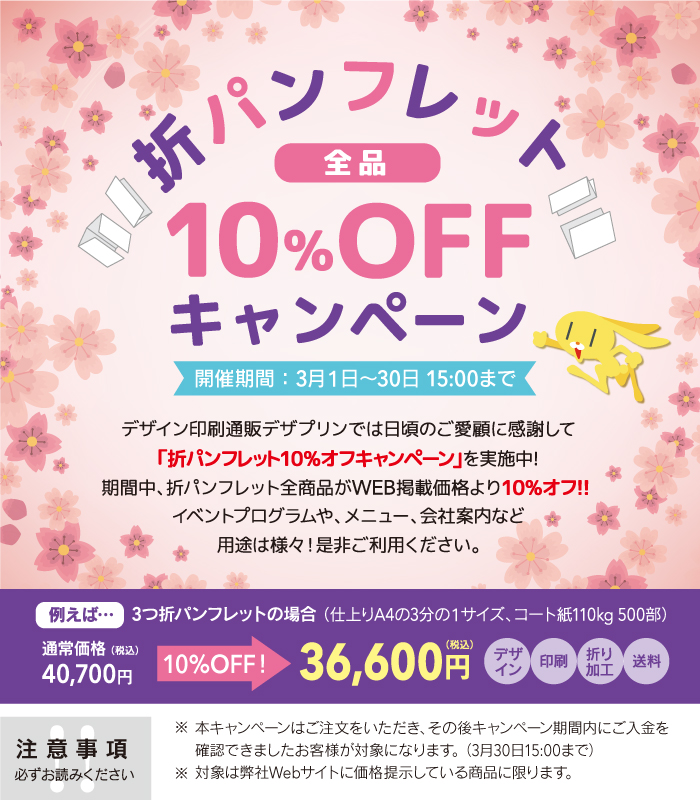 折りパンフレット10%OFFキャンペーンチラシデザイン印刷ならデザイン印刷通販デザプリン。
