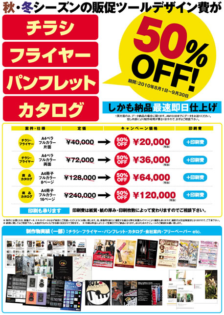 秋のチラシ半額キャンペーン。チラシ、パンフレットなど今ならデザイン半額で。
