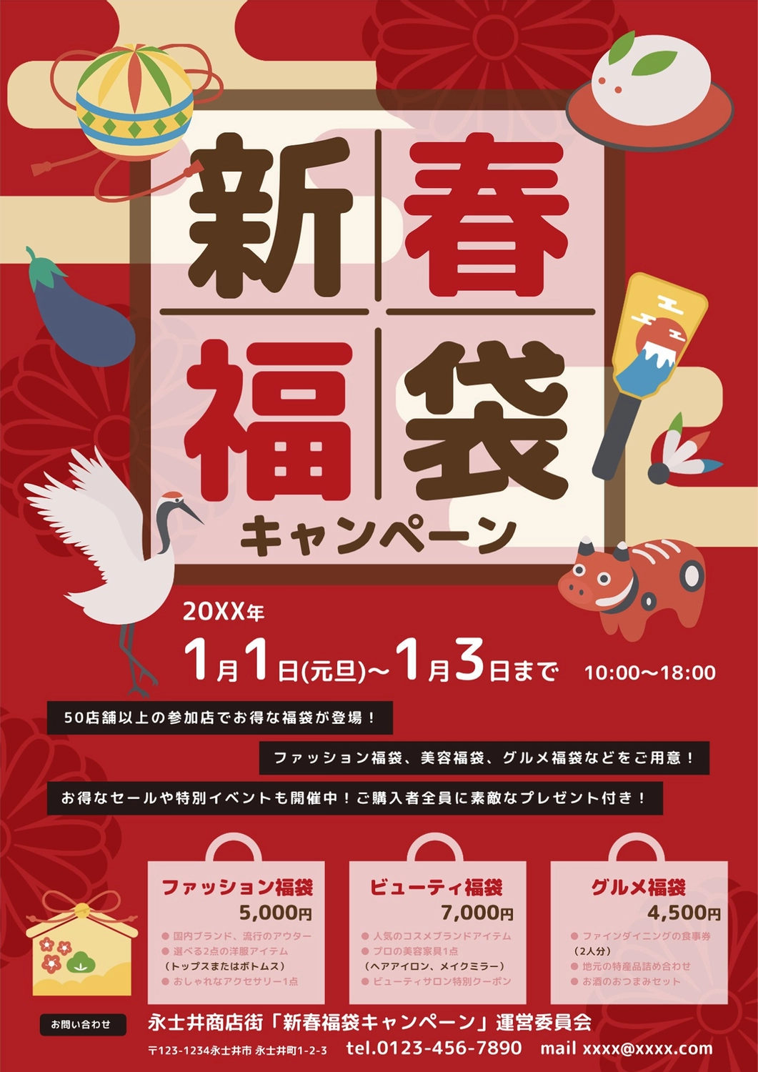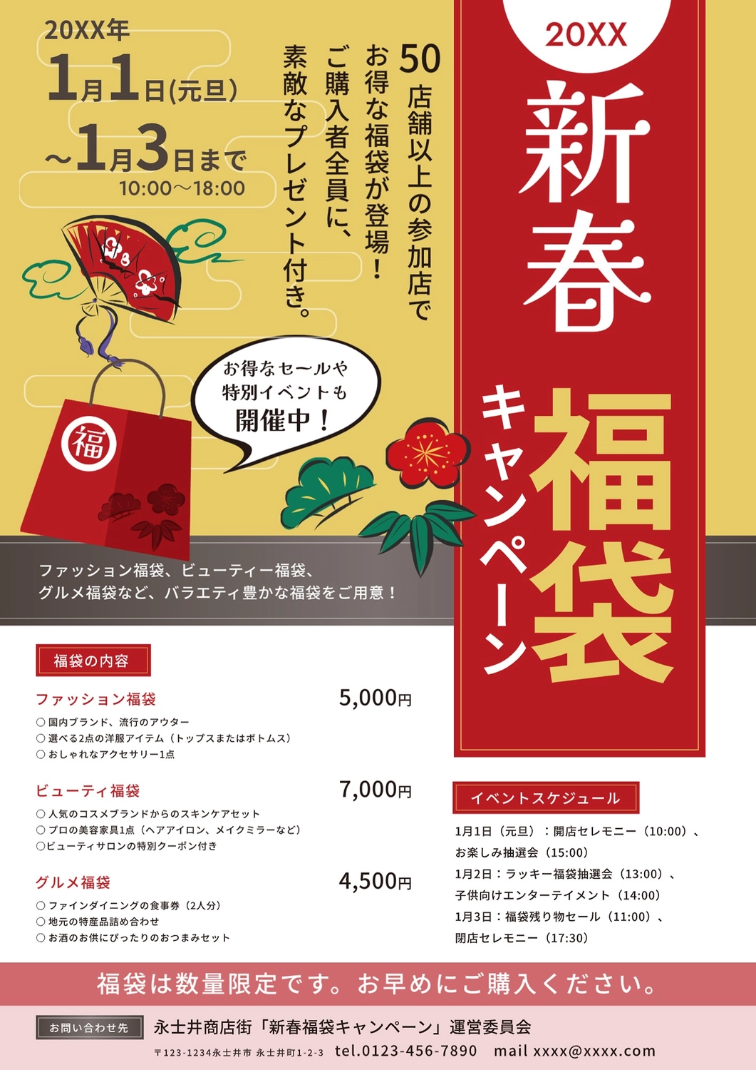紙袋や扇子のイラストを使った大人向け新春福袋キャンペーンのチラシ の無料チラシテンプレート 17235 - デザインAC。