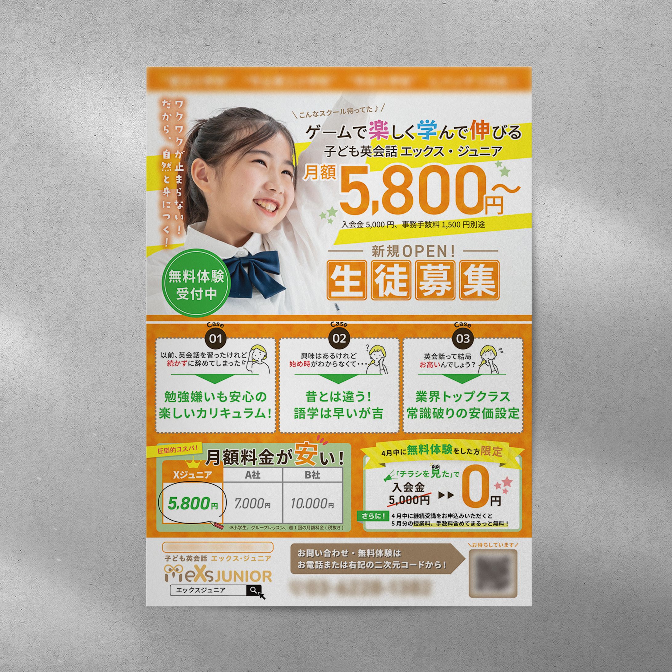 チラシデザイン:こども英会話教室 新規OPENに伴うキャンペーン用 制作実績。