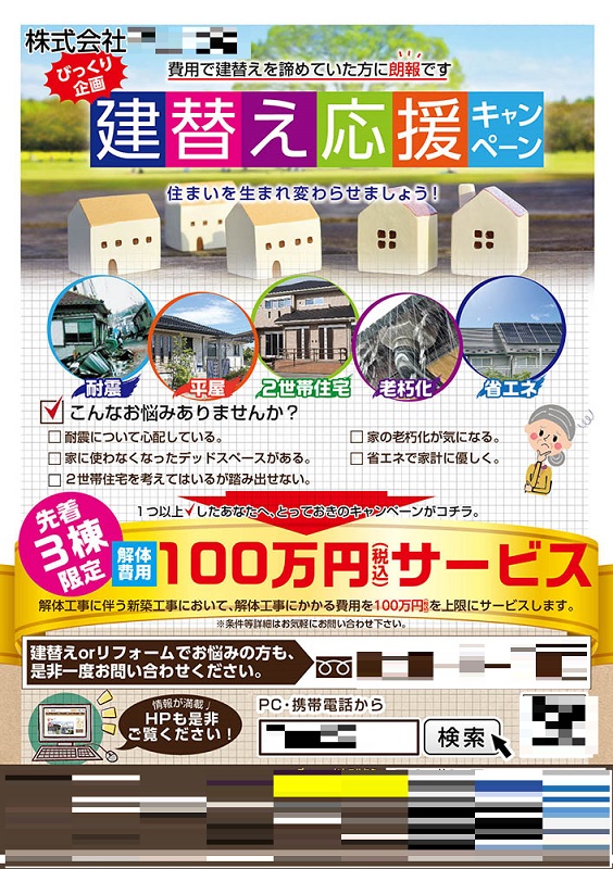 建て替え応援キャンペーンチラシデザインリフォーム・外壁塗装のチラシデザイン、ホームページ制作はチームカスガイ。