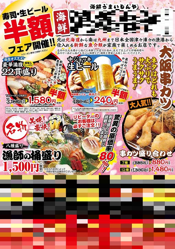 春の半額キャンペーンチラシ飲食店のチラシデザイン作成・印刷なら飲食チラシ制作.com。