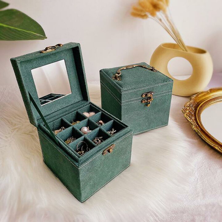 楽天市場 ジュエリーボックス 大容量 可愛い アンティーク風 アクセサリー 収納 ケース ミラー 引き出し おしゃれ 持ち運び 鏡付き ジュエリーケース化粧箱 アクセサリーケース アクサセリーポーチ ファッションボックス グリーン 緑 無地 スクエアボックス マット。