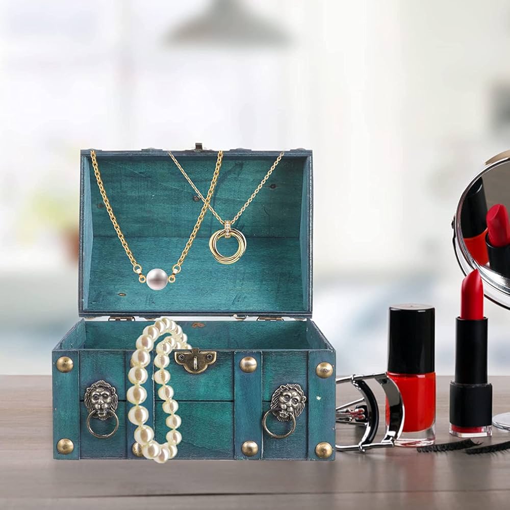 Amazon木製宝箱 貯金箱 宝箱 ジュエリー箱 木製 アンティーク 収納ボックス 小物入れ 宝石箱 ふた付き アンティーク風 アクセサリーボックスアンティーク箱 ジュエリーボックス インテリア 装飾品 青緑 ジュエリー収納 オンライン通販。
