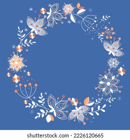 冬の花はフレームを囲みます。ギフトカード、招待状、Webバナーのテンプレート。4色のベクターイラスト。青の背景に花柄のビンテージ装飾手描きの画像。」のベクター画像素材 ロイヤリティフリー2226120665Shutterstock。